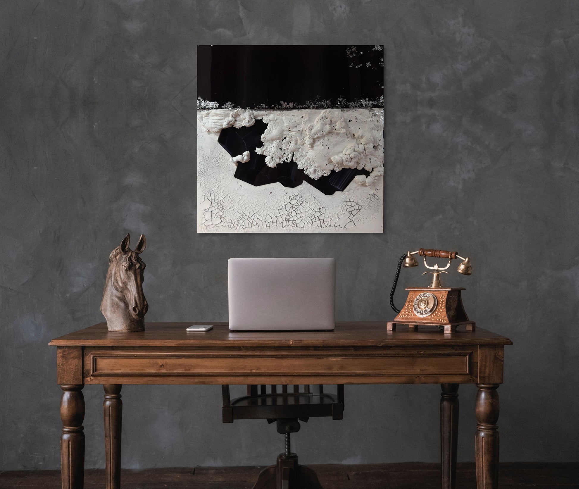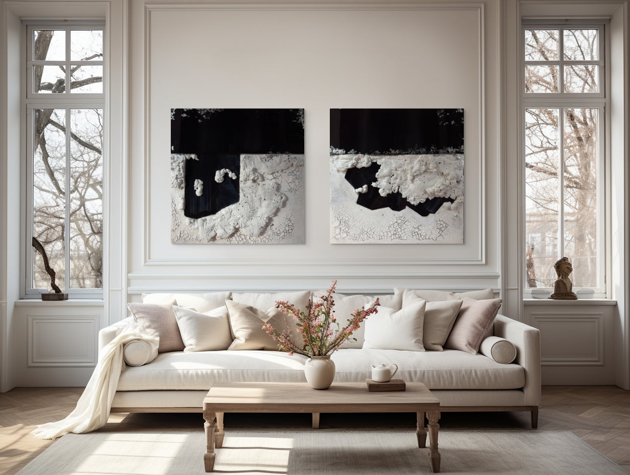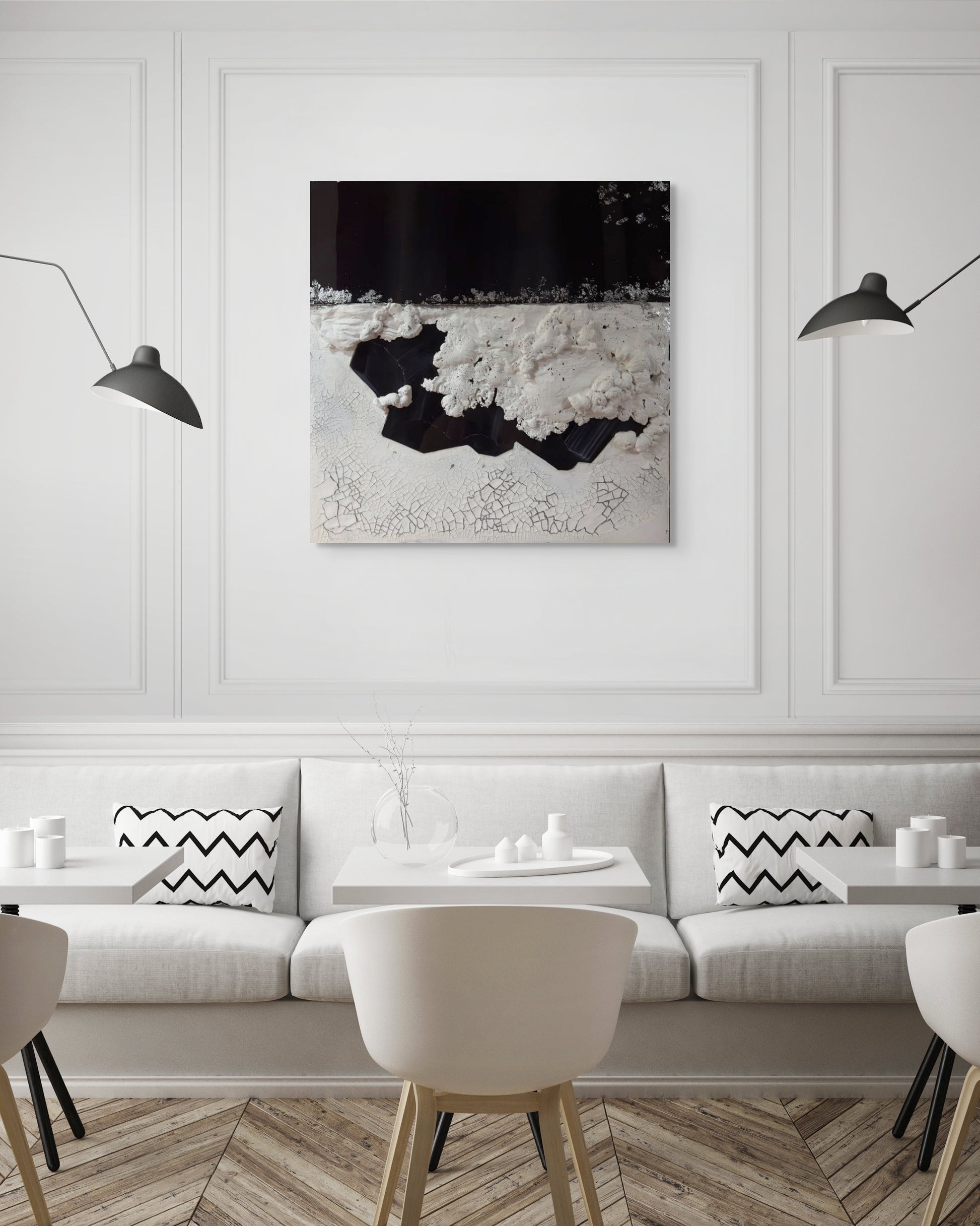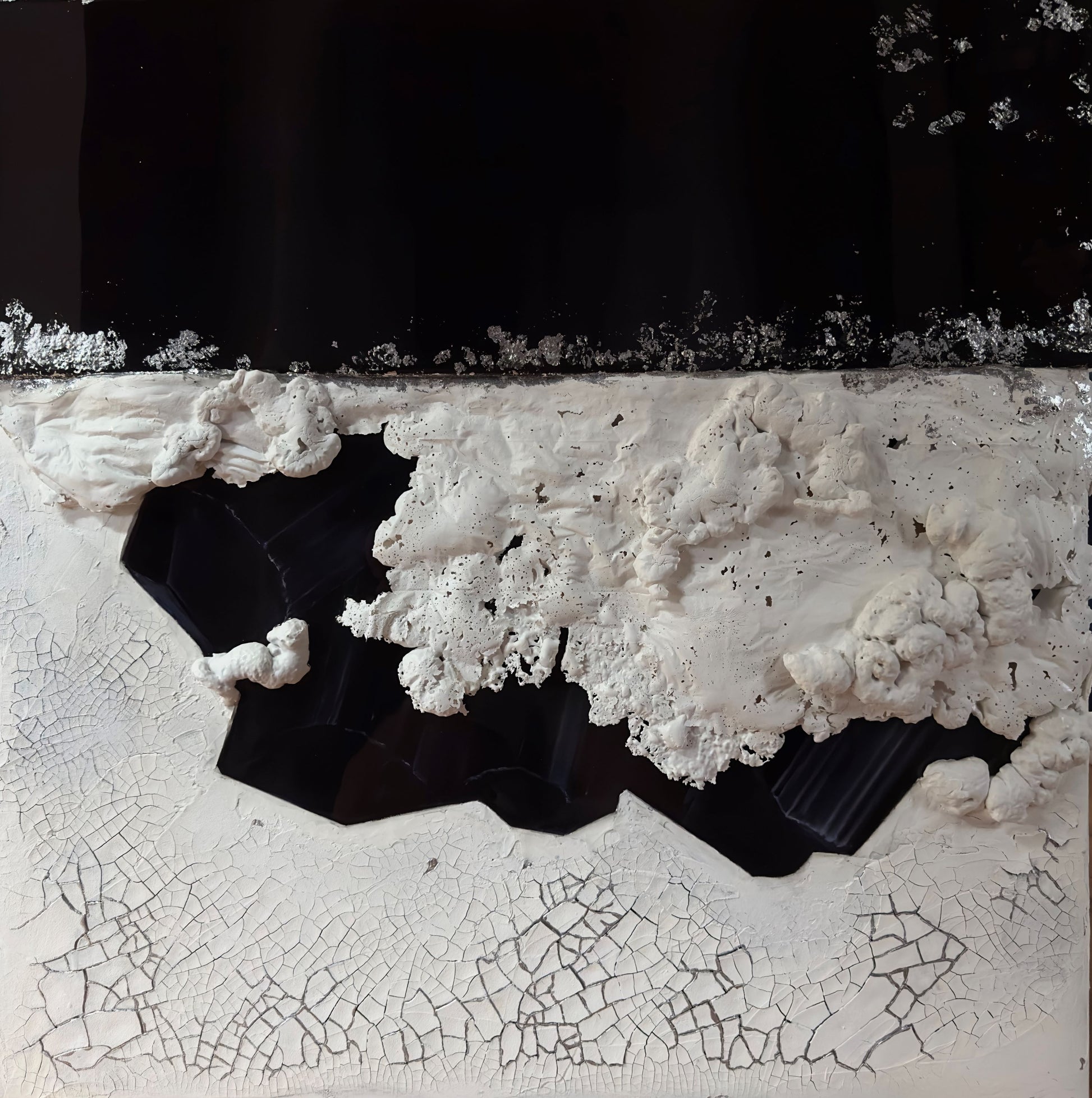 Cracked white textures evoke the earth’s surface under pressure, while natural black crystal forms emerge from within, like tectonic truth revealed. Subtle resin-coated areas contrast with rough, raised textures, creating a bold yet balanced 3D effect. The interplay of matte and gloss, light and shadow, adds depth to the stillness.