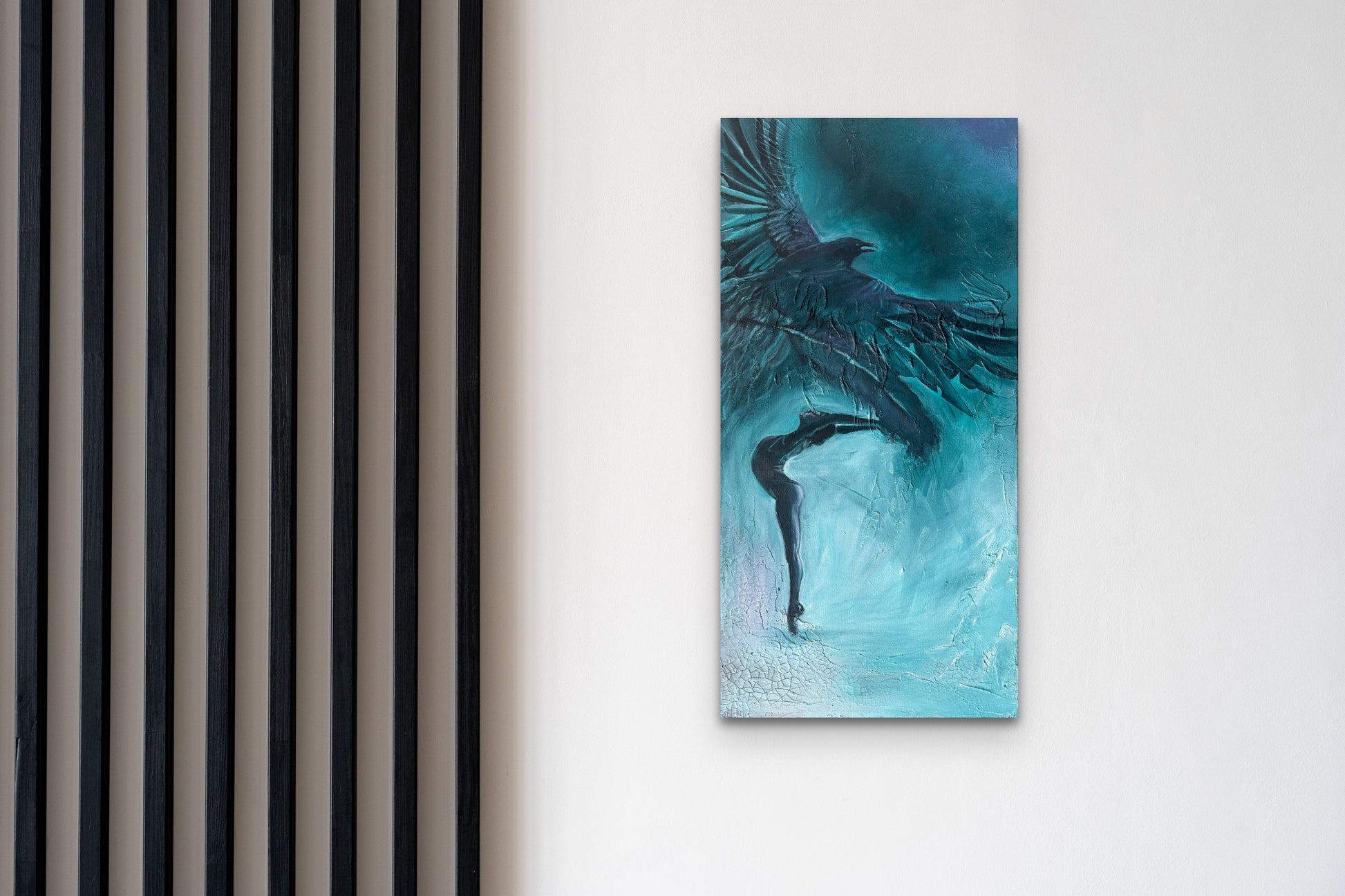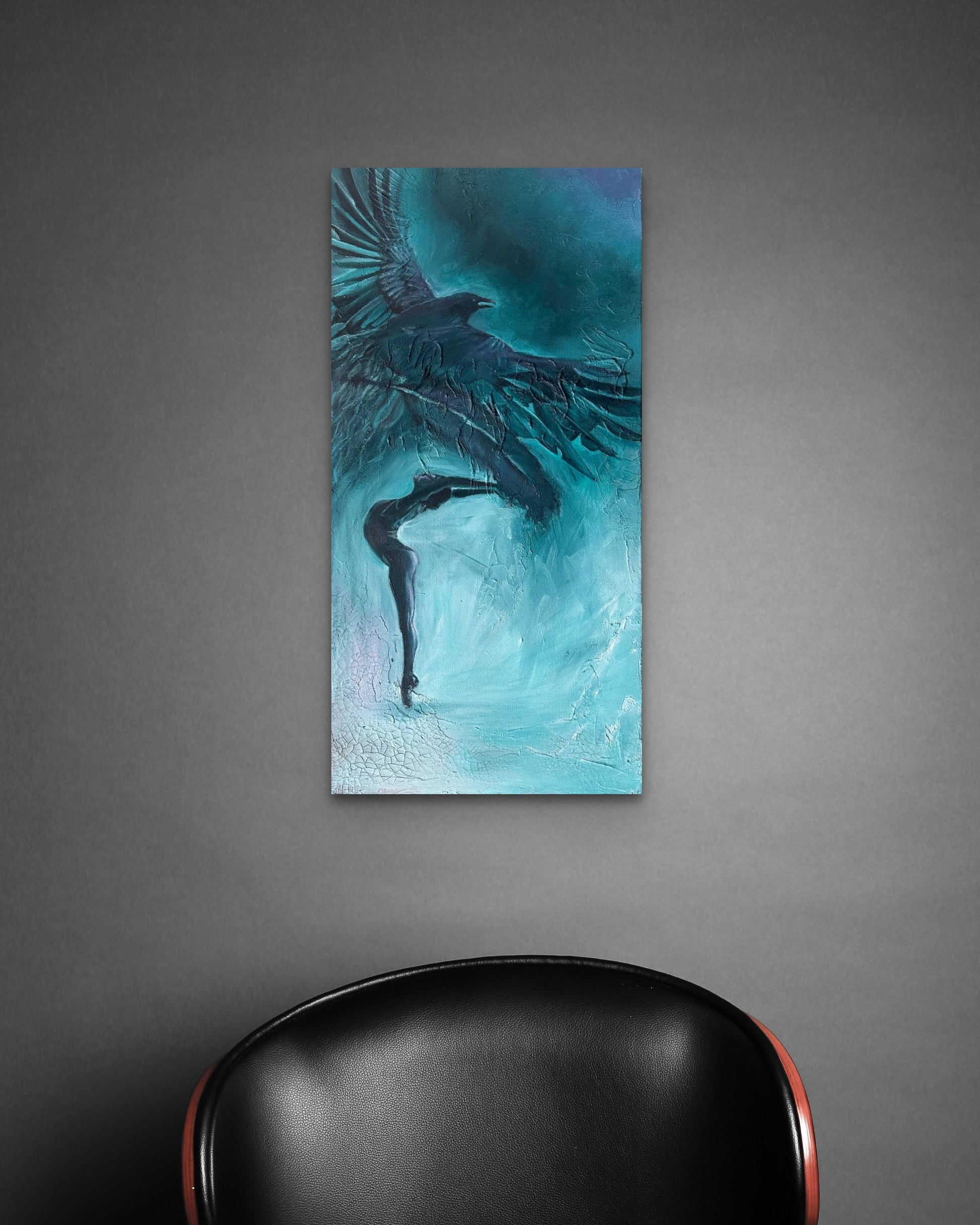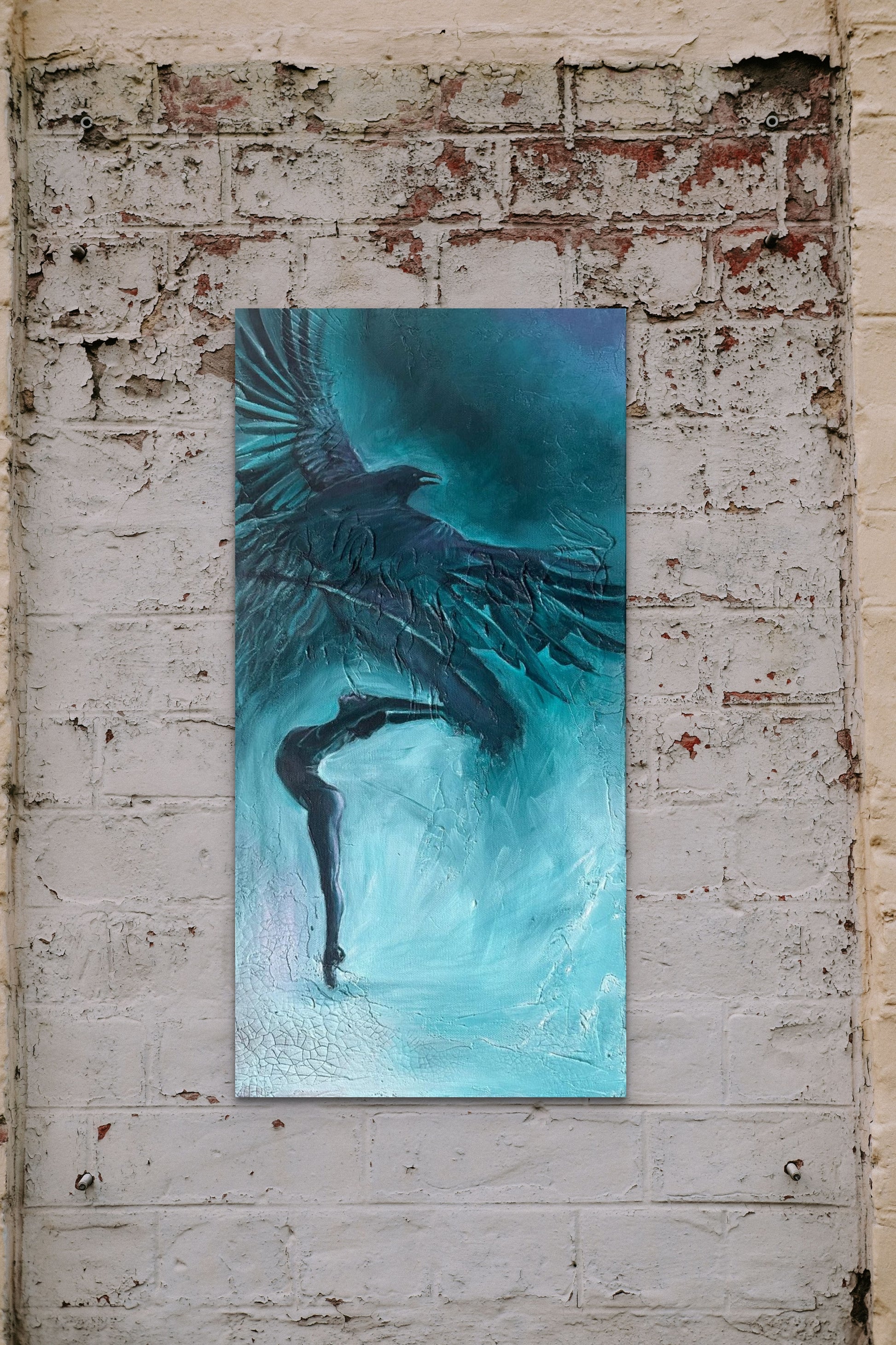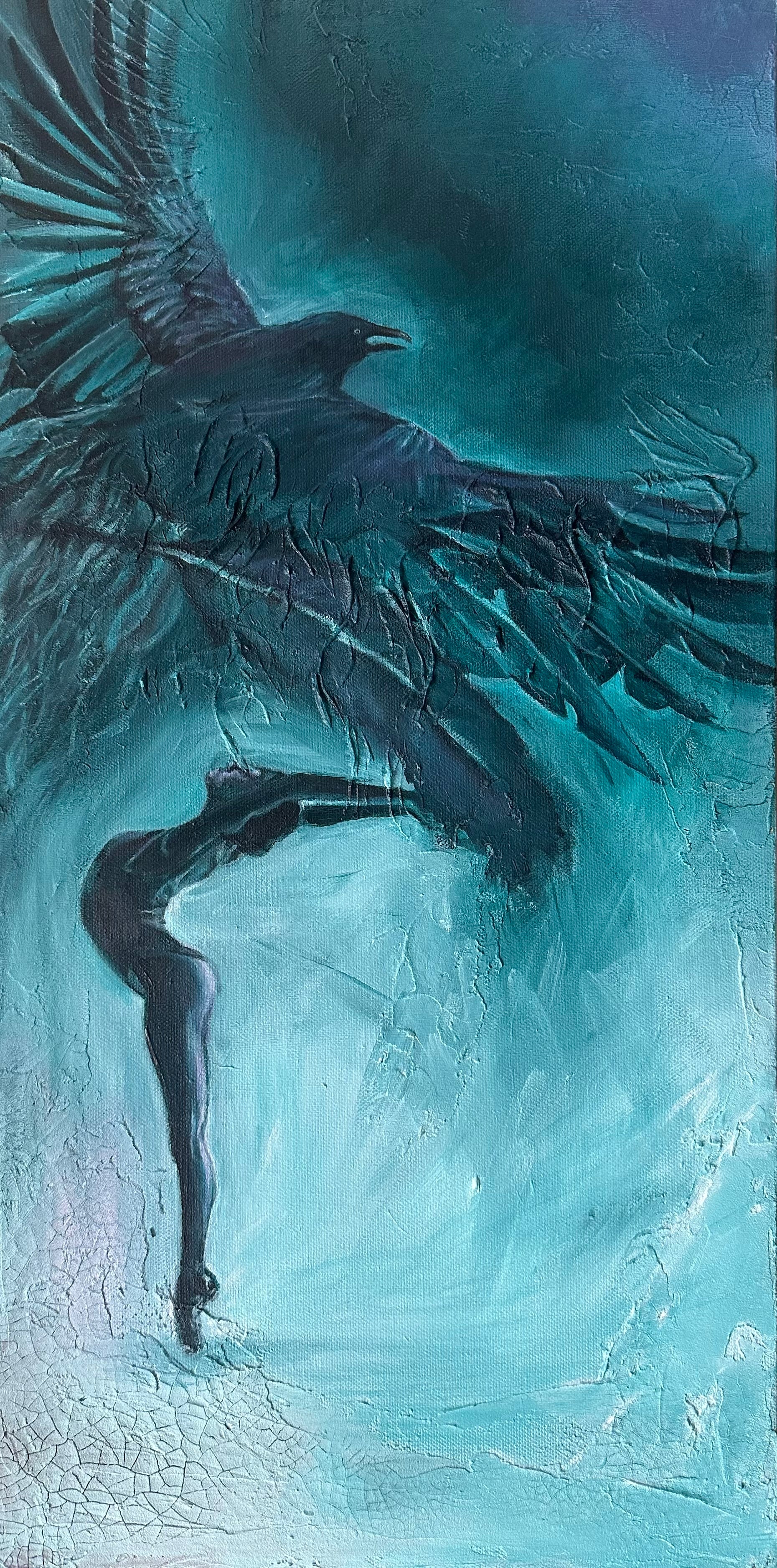 In contrast, a graceful ballerina takes the foreground, elegantly posed in a ballet stance. She embodies our dreams and aspirations. With determination, she reaches for a single raven's feather, just out of her grasp, symbolizing hope and transformation.