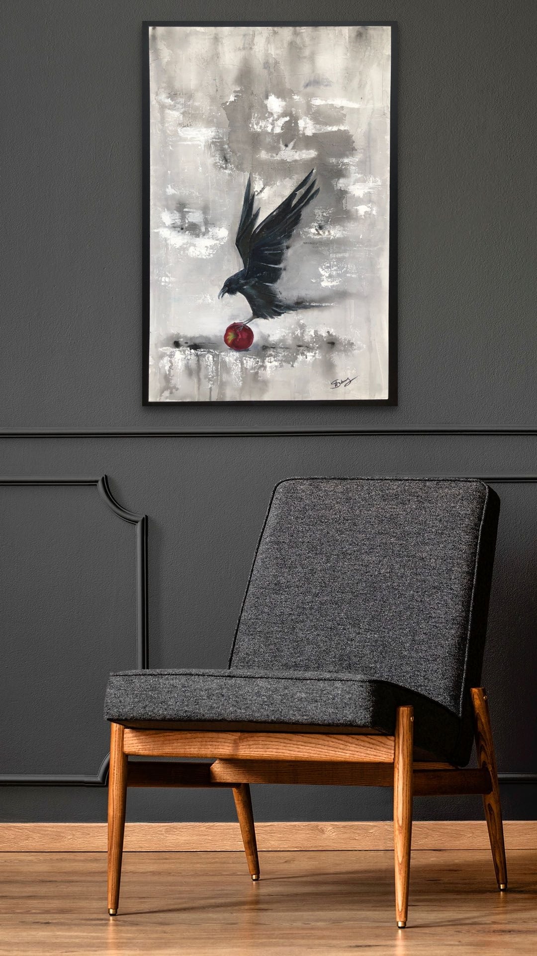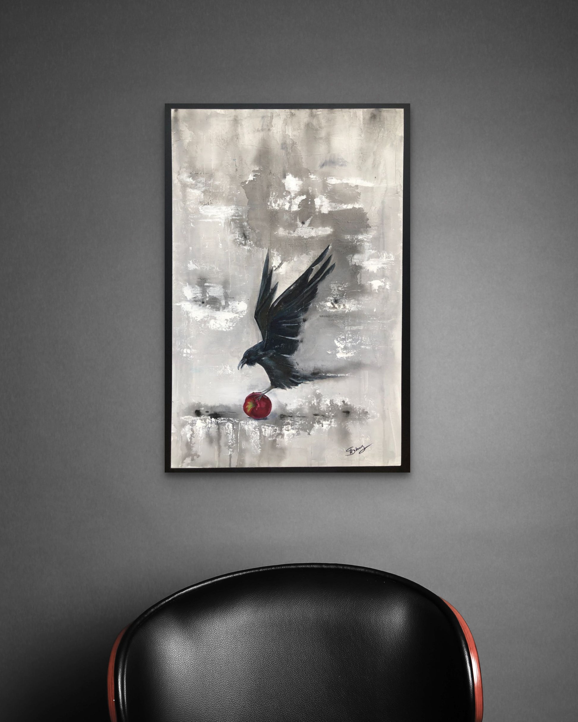 On the canvas, a mysterious scene unfolds. A sleek raven symbolizes the unknown and transformation, like a black hole in space, which draws in all energy toward itself and releases it in new forms. Below, a single apple glows softly, loaded with meaning from the ancient stories of temptation and sin. Together, they create a powerful story, open to interpretation. The raven, a messenger spirit in Native American beliefs, connects worlds. The artist's mix of materials adds depth, making the scene feel mysterious. This painting, "Raven Magic," isn't just art—it's a doorway to deeper understanding and emotion.