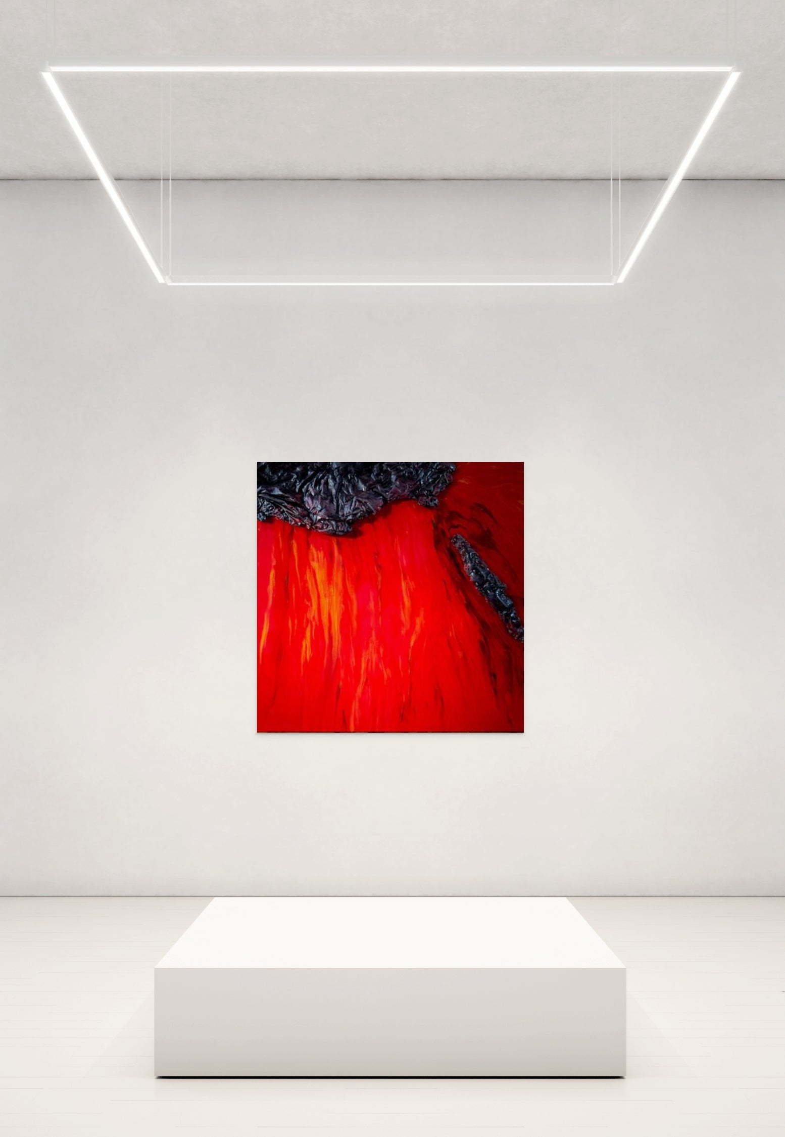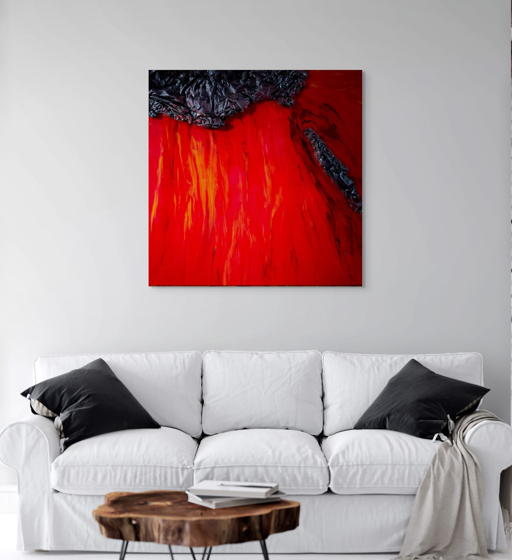 With intense reds and molten textures, this work simulates the movement of hot lava flowing through fractured stone. Deep, sculptural ridges and charred elements rise from the surface, while sections coated in glossy resin evoke the sheen of fresh magma cooling into glassy obsidian.