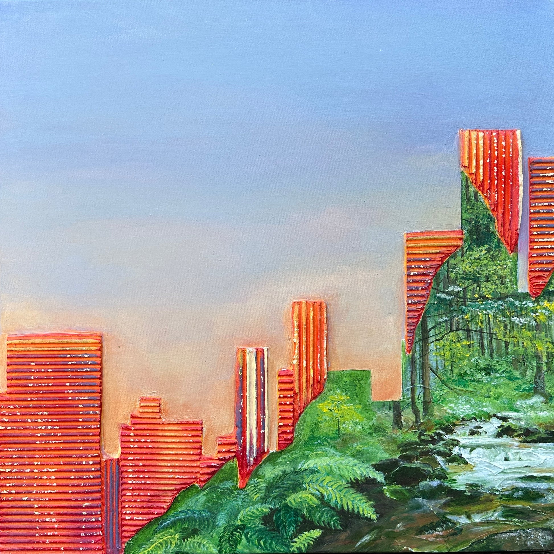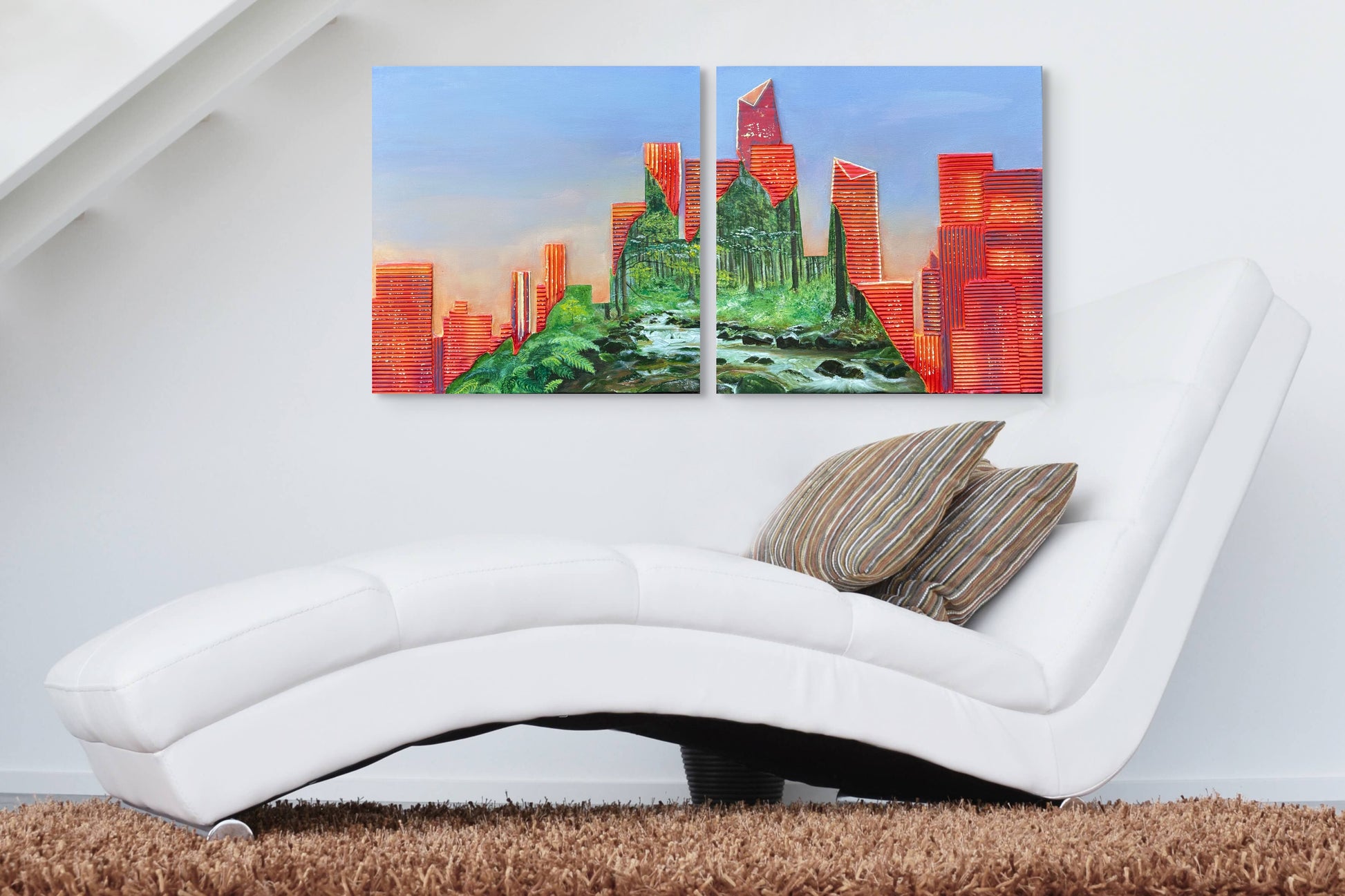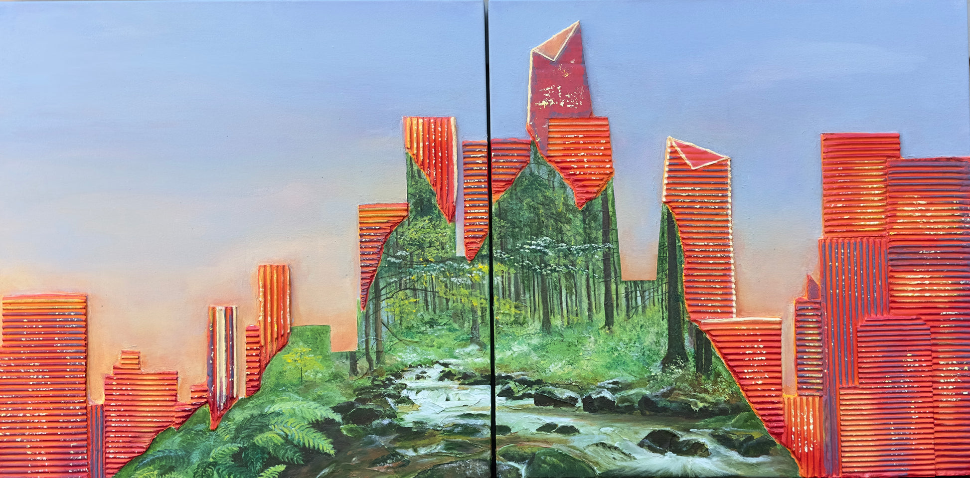 "Summer Escape" is a captivating diptych that merges the contrasting worlds of a hot city landscape and the serene beauty of a cool forest. The two separate canvases seamlessly form a unified collage, inviting viewers to transition from the intensity of city life to the tranquil embrace of nature. Crafted from recycled cardboard, the artwork offers a unique 3D effect, enhancing its immersive quality and highlighting the artist's commitment to sustainability. This piece not only visually contrasts heat and coolness but also symbolizes the timeless human desire to find refuge and rejuvenation in nature's beauty.