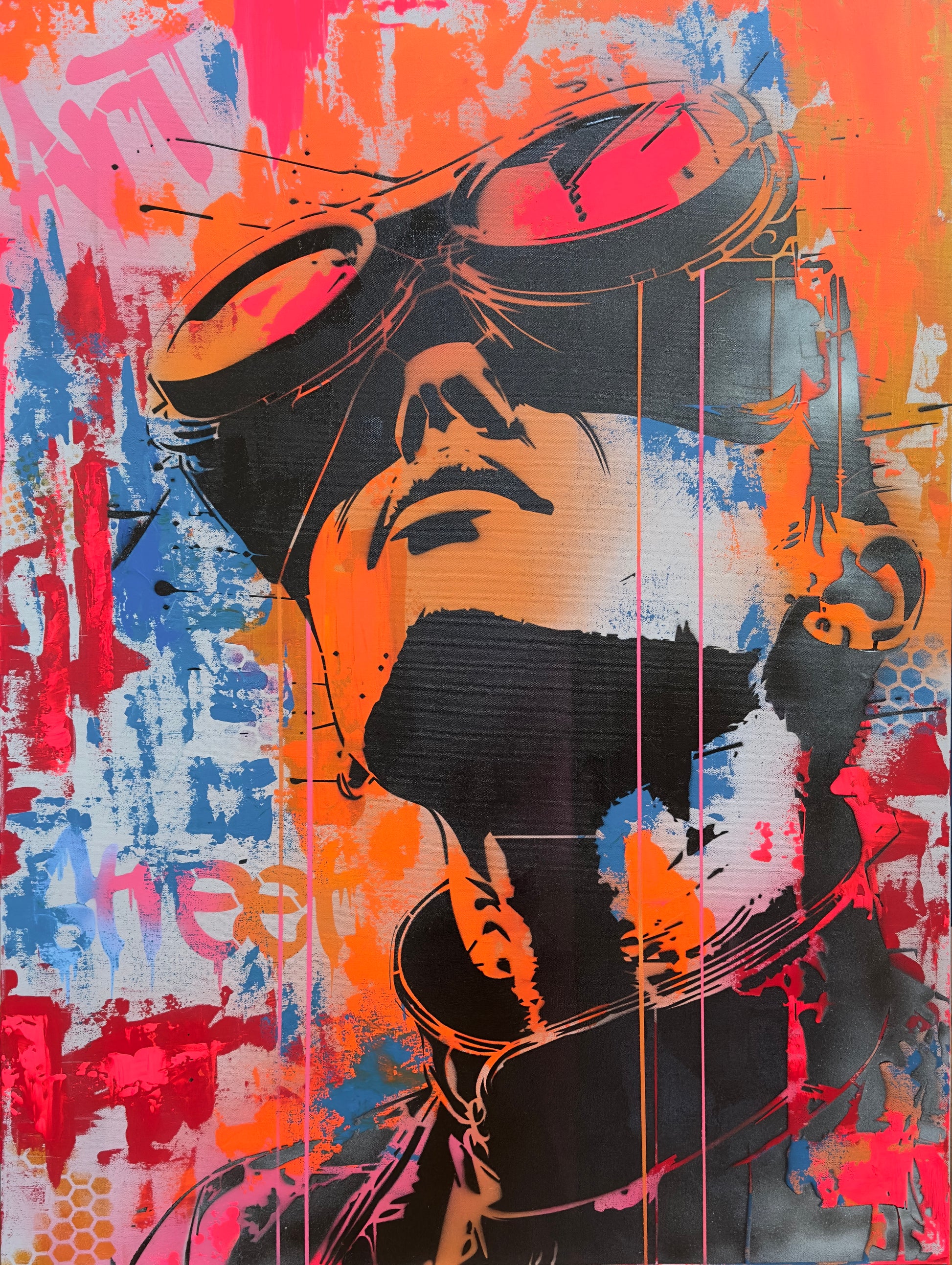 Virtual Streetscape is a dynamic street art-inspired painting that bursts with vibrant colors, creating a lively and immersive urban scene. The contrast between the colorful background and the monochromatic figure creates a powerful visual statement, symbolizing the merging of reality and virtual experiences. This captivating piece brings energy and contemporary edge, making it an iconic addition to any modern art collection.